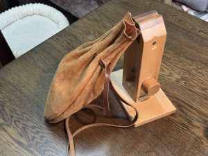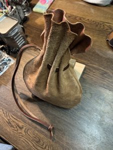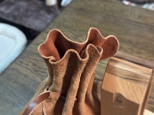 皆様 こんばんは。まだまだ寒い日が続いておりますが、いかがお過ごしでしょうか。昨日、雑誌でスェード革の巾着袋を見て急にほしくなり、余っていた革を使って早速作ってみました。ヴィンテージ感を出すために、あえて革を雑に裁断したり、水に濡らしてよれよれにしたりして作りました。